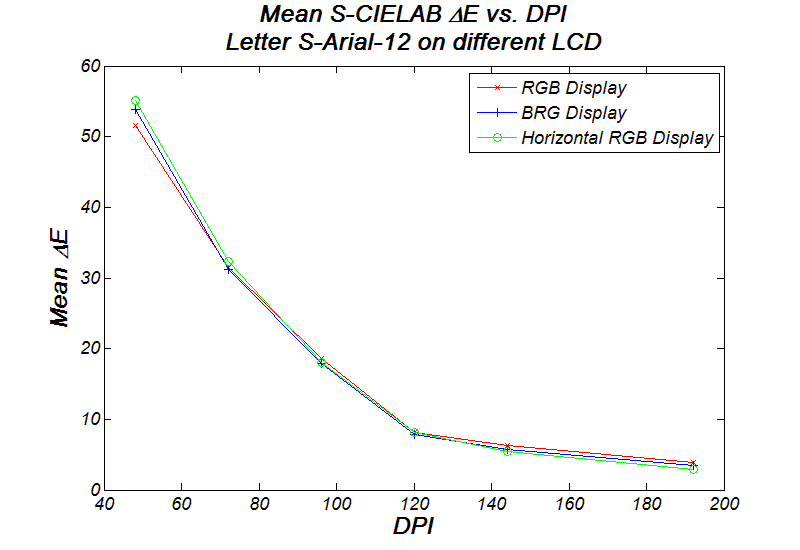 I also tried to show the same ClearType fonts on LCD with different sub-pixel structure (RGB, BRG, or horizontal RGB). The following is a plot of the mean SIELAB Delta-E value versus DPI, letter S-Arial-12 observed at 18 inches away. It suggests that the amount of the colorfulness introduce are approximately the same, which is due to the symmetric filter kernel I chose.