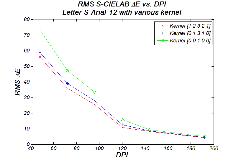 So far, we concluded that DPI is a key determinate factor in the amount of colorfulness being introduced. What about the filtering process in ClearType? Filter kernel should be another key factor in determining the colorfulness. In this experiment, I plot the RMS S-CIELAB Delta-E value versus various DPI. I used three different filter kernels: [0 0 1 0 0], [0 1 3 1 0], and [1 2 3 2 1] to filter the letter S-Arial-12, which are again observed 18 inches away. As shown in the graph, the color filter kernel [0 0 1 0 0] introduces the most color artifacts to the fonts out of the three, while the other two have very close performance. It seems that the wider the kernel spreads, the less colorfulness is introduced. As DPI increases, the color artifacts becomes more and more irrelevant, which converge into the same value eventually.