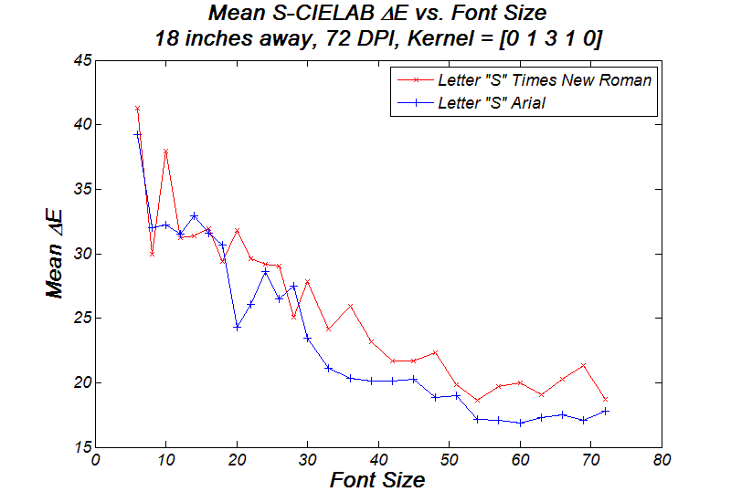 Different font families have their own characteristics, i.e. sharper edges, heavier weights, variable width, etc. I examined the two most popular font families on Windows systems: Times New Roman and Arial. I simulated letter S from each family and record the mean Delta-E value as varying the font size. The graph implies that S-Times-n introduces a little bit more color artifacts than what S-Arial-n does. My understanding of it comes from the tradeoffs between sharper edge and colorfulness. In order to keep the sharpness of S-Times-n, a bit more colorfulness is introduced than it is for S-Arial-n.