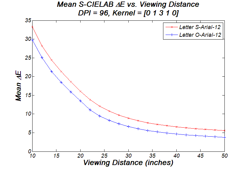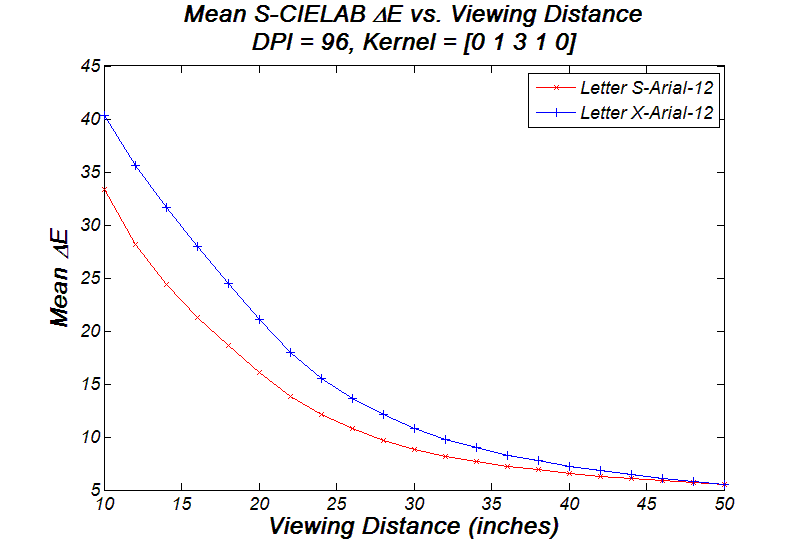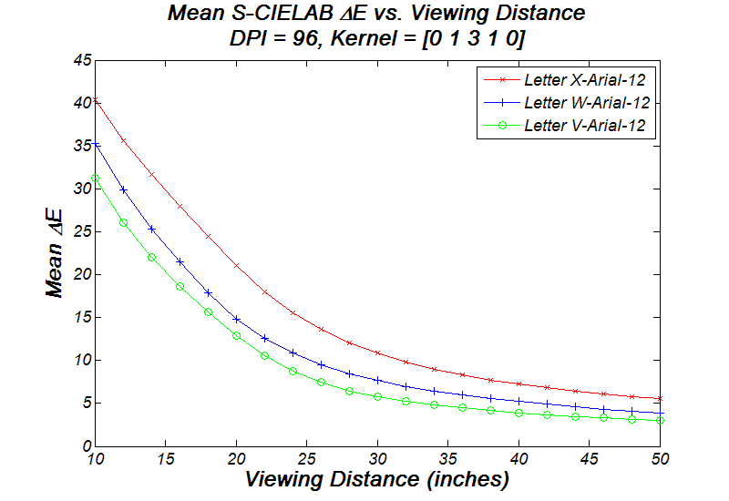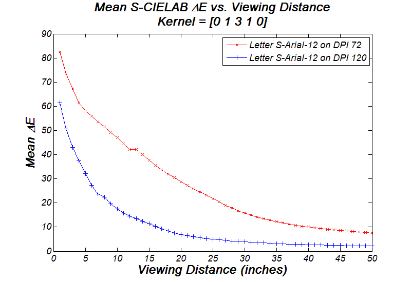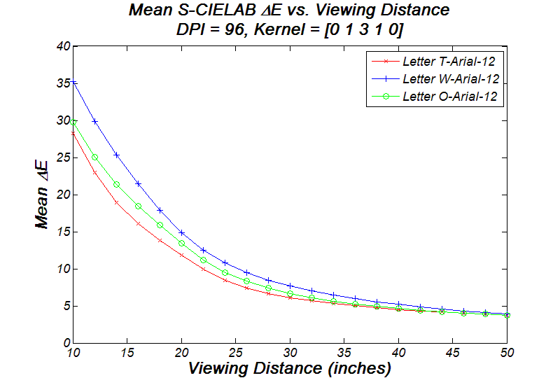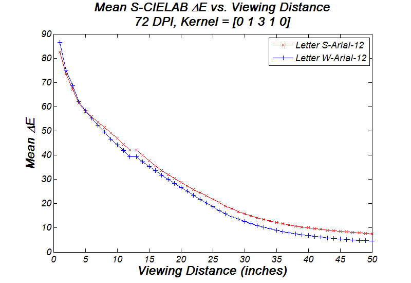 Now let's try moving closer to or farther away from the LCD. The following graph shows the mean Delta-E value versus viewing distance; the study subjects are two letters, S-Arial-12 and W-Arial-12, both being filtered by filter kernel [0 1 3 1 0]. Basically the graph suggests that it is better to view size-12 fonts at least 30 inches away from a 72-DPI LCD. Color artifacts increase dramatically as one approaches to the LCD.