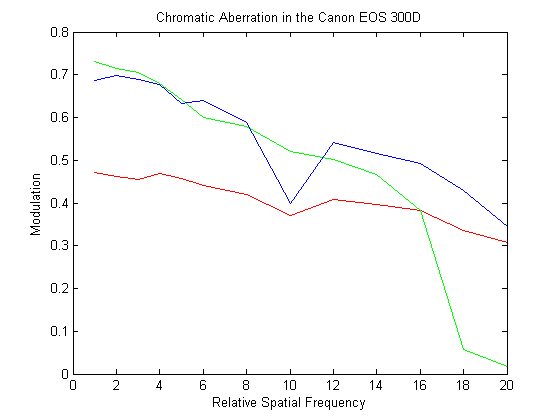 Figure 9. Canon 300D MTF for red, green, and blue light.