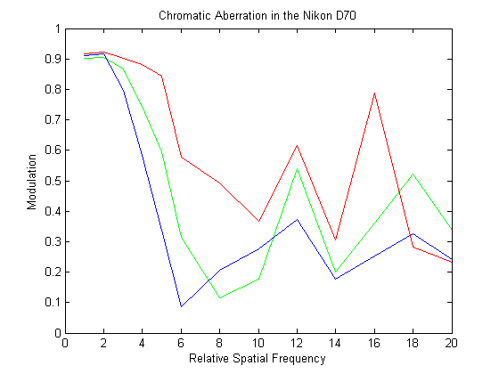 Figure 8. Nikon D70 MTF for red, green, and blue light.