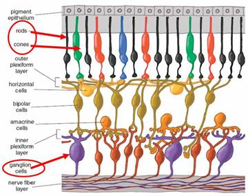 the photoreceptors, but leave the retinal ganglion cells unharmed. Retinitis pigmentosa involves the