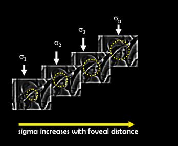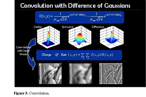 Since receptive fields increase in size with distance from the fovea, we convolved the input image with Gaussians of many different sigma values so that pairs of images could later be chosen according to the desired size of the receptive field center and surround. Figure 5 shows the result of convolving the input image with Gaussians representing the center and surround responses, then taking the difference of the resulting images. The intensity of each pixel in the difference image indicates the change in spike rate for the ganglion cell whose receptive field is centered at that pixel.