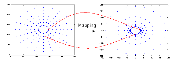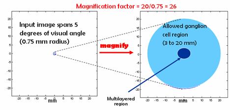 In order to avoid these regions, we magnify the 5 degree (0.75 mm in radius) visual field to a region 20 mm in radius around the fovea. Since we need to avoid the multilayer region, we do not even bother sampling the points that will be mapped to this region. An alternative would have been to sample everywhere, but then discard any points that fall in the multilayer region. The mapping idea is depicted in Figure8.