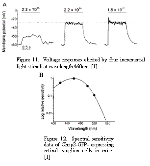 First group of constraints was related to the properties of light-evoked voltage response of ChR2-expressing neurons described in [1]. Figure11 shows the voltage responses of these neurons. The experiments showed that the threshold light intensity required for producing responses in ChR2-expressing retinas was near 1014 – 1015 photons cm-2 s-1 [1]. In addition to intensity limitations, it was found that the ganglion cells expressing ChR-2 were most sensitive to the wavelength of 460nm. The spectral sensitivity is shown in Figure 12. Given these two findings, the devices suitable for our purpose had to satisfy these spectral and intensity requirements.