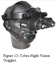 Finally, the ergonomics considerations were taken into account. The ideal prosthesis device has to be small and light. Lower power consumption is desirable as the space to accommodate power supply will be limited. The night vision goggles (Figure 13) can serve as an example of how this prosthesis could be mounted on one’s head. On average, typical night vision goggles weigh two pounds and are not comfortable to wear for extended period of time. Therefore, using a helmet to house all device components except for the optics may solve the issue of too much weight on a persons face.