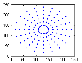 In our implementation, the images were uniformly sampled radially according to the number of sampling levels. A uniform angular sampling was adopted. Figure 7 shows the superimposed sampling pattern of all the spike rates for 7 circular levels and 20 samples per circle.