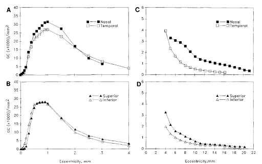 Another fact to consider is that ganglion cell density drops exponentially as we move away from the multilayered region (Figure 9 C and D).