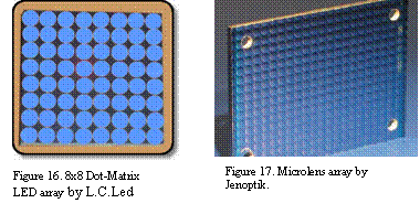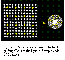 Microlens array (Figure 17) can be used to couple the light beam from the LED array to the taper. Microlens arrays with 3mm lens diameter and focal length ranging from 0.02 to 20 mm are available from Epigem (www.epigem.co.uk). The shorter focal length is preferable to keep the size of the device to minimum. Tapers of various fiber sizes and geometrical configurations are available from Ceramopec and Schott (www.ceramoptec.de, www.schott.com). The fibers in the taper can be mapped from input to output in several different ways. Assuming the mapping can be customized, it is desirable to have the fibers on the square input and the round output ends to be arranged as shown in Figure 18. Such an arrangement of output fibers is based on the ganglion cell density distribution in the retina: higher density in the central region and lower – at the periphery.