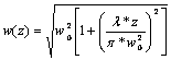 The output of the taper is the set of parallel beams of equal diameter that need to be diverged to target the ganglion cells distributed over a nearly spherical surface of the retina. This may be achieved with a suitable negative lens placed between the taper output and the eye. The light refraction in the eye has not been addressed in this project, it is assumed that the beam will travel along a straight from the lens to the surface of retina. To estimate how much each beam diverges traveling from lens to the retina, a Matlab function getBeamWidth was created. The function assumes the Gaussian shape for each beam, and its initial width is taken as the diameter of the taper output fiber w0. Then the width of the beam at distance z can be found as: