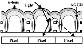 The benefit of such a design is two-fold. First, light inside the pixel light tunnel at an angle less than the critical angle of the oxide-air interface should be reflected and land on the photodiode. Second, any light that does not undergo TIR at the oxide-air interface is refracted at a more vertical angle, meaning that it will travel less distance laterally and have less likelihood of reaching the active area of the adjacent pixel. Given an index contrast between silicon dioxide and air of 1.46, we would expect a critical angle of over 46°, more than sufficient for most sensors. In real situations, this air gap would have a rounded shape, but was approximated as rectangular for simplicity. The air gaps are formed by selectively etching away a nearly vertical line of oxide where the air gaps should be. Then a film is deposited on top that pinches off the hole and seals the air gap. While this seems simple, the process is quite difficult and care must be taken to ensure that other materials do not reside in the voids. Other than the spacing of the air gaps, which was preset for this study to keep the comparison between the techniques fair, there is the additional degree of freedom of the width of the gaps. For very narrow air gaps, it is possible that light may "leak" through the gap even when it should be reflected. To test this effect, two air gap widths of 0.1 µm and 0.2 µm were simulated. |
