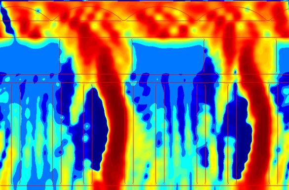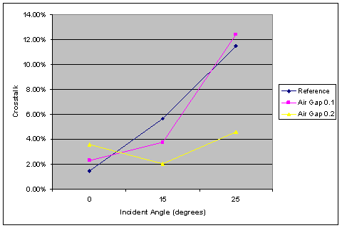 Results - Air Gaps The air gap results demonstrate a strong dependence on the thickness of the gap. For the 0.1 µm void, there is a significant amount of coupling to the other side of the gap. In the 0.2 µm case, there is less coupling, but the increased width of the gaps allows a smaller aperture for the light to enter. The latter effect dominates at normal incidence, where the thinner voids have a higher transmission and lower crosstalk. At an angle, however, the coupling through the gap is enhanced, leading to declining transmission and increasing crosstalk. As Figures 11 and 12 show, the wider air gap is able to confine the light more efficiently and therefore performs better for off-axis incidence.
