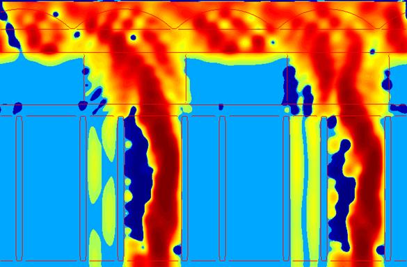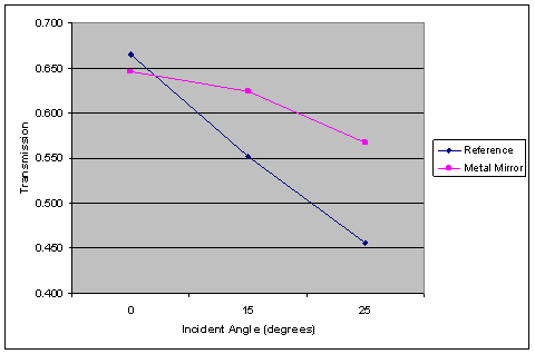 Results - Metal Mirrors As expected, the metal mirror design performed very well due to its ability to reflect light at any angle. Aluminum is a very good reflector, as demonstrated by the lack of field penetration into the metal, so the loss in transmission at higher angles is not due to absorption but to light missing the top aperture. As the results show, crosstalk is incredibly low, less than 0.03% for all angles.