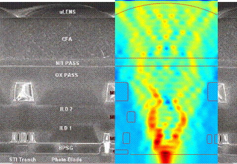 Methods Finite-Difference Time-Domain (FDTD) Simulation To simulate the propagation of light inside the image sensor, we used Finite-Difference Time-Domain (FDTD) simulation. FDTD is well-suited for simulation of the behavior of light on a sub-wavelength scale, a regime where diffraction and other complex phenomena dominate. Given a layout, material parameters (refractive index), and a light source, this technique explicitly solves Maxwell's equations for electric and magnetic fields at finely spaced (~10 nm) grid points. It then moves forward in time by a very small amount (~10^-17 sec, about the time it takes light to travel a few nanometers) and solves the equations again using the previously solved values. After a number of time steps deemed sufficient for convergence to a steady-state solution, the energy flow, known as the Poynting vector, is computed and displayed as in Figure 2. In addition, the power flux falling on an arbitrary surface, such as the active pixel area, is calculated. The construction of the FDTD layouts and display of the Poynting vector with the pixel structure outlined was facilitated by Matlab scripts that Chris had written in the course of his research assistantship.