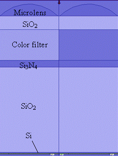 FDTD Pixel Simulation The specific software package that we used, OptiFDTD, is capable of full three-dimensional simulation, but processing time restricted our work to two dimensions. The particular type of FDTD simulation we used was continuous wave, meaning that only one wavelength of light is used. Since each simulation was at a specific wavelength, we restricted our work to three wavelengths representative of the color filters in a CMOS image sensor: 450 nm (blue), 555 nm (green), and 650 nm (red). This also means that we only needed to know the materials' characteristics at these wavelengths, although we sacrifice knowledge about the behavior of the image sensor at the in-between wavelengths. We obtained refractive index data for some materials from Palik [2] and made approximations for others. Since we worked in two dimensions, the simulations are a cross-sectional approximation of an actual pixel. Given that we are modeling a finite area, it is important to define the simulation behavior at the edges of the domain. In the direction parallel to the image sensor plane, we used periodic boundary conditions that would effectively "wrap around" any electromagnetic wave to the other side. In the direction normal to the image sensor plane, we set absorbing boundary conditions so that light that was incident on these edges would leave the domain. Even with a robust simulation tool, the evaluation of crosstalk is not straightforward because it is impossible to separate the light that is intended for one pixel from the light intended for another pixel. While it is simple to restrict the incoming light to the width of a single pixel, the wave will quickly spread out due to diffraction. As a result of tests done by Chris during his research assistantship, it was decided that strongly absorbing "black" color filters would be used as the color filter of the neighboring pixel. While diffraction would still occur after the color filters, it would be less drastic and take place further down the optical path, reducing its influence. Pixel Structure The pixel structures were made to be generic representations of current examples in literature. Although the structure has been significantly simplified, the overall optical characteristics of the pixel are the same. The pixel, as laid out in OptiFDTD, is shown in Figure 3 and described below.