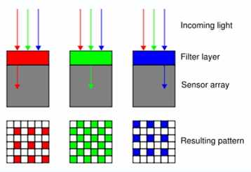 To simplify the image capturing process, many cameras use a single sensor array with a color filter array. These sensor can only detect the intensity but not the frequency of incoming light. However, since each color filter in the color filter array only allows part of the spectrum to pass though (commonly Red, Green or Blue), each sensor only captures 1 color. The resulting image will be a mosaic image having a pattern determined by the color filter array.