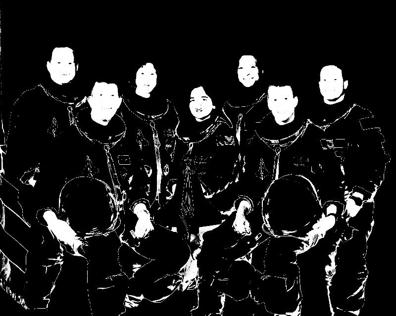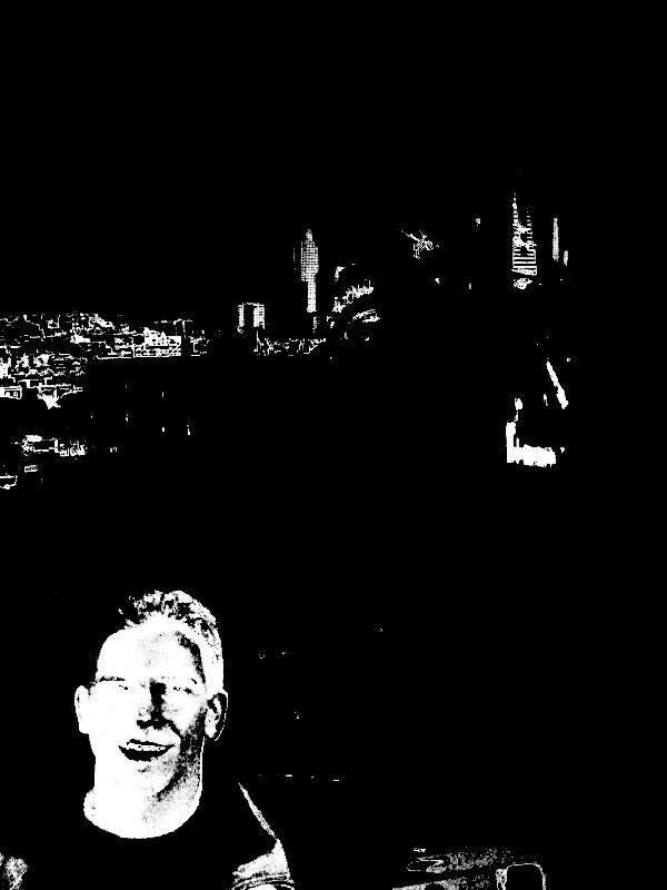 First all the template faces are loaded, converted to Lab and averaged so that a single pair of (a,b) values are obtained. This would be the reference skin color. Next the distance in the (a,b) space from each pixel in the photo to the skin color is calculated, obtaining a difference image. For example, the next two images show the original photo, and the difference image to the skin color.