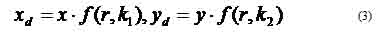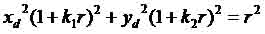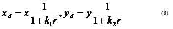 The geometric undistortion problem is to calculate (x,y) from (xd,yd) given the distortion coefficients (k1,k2) that are determined through the nonlinear optimization process. From equation (8), we have the following quadratic function for r