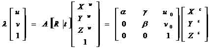 where (u, v) is the distortion-free image point on the image plane. The matrix A fully depends on the camera's five intrinsic parameters (α, γ, β, u0, v0) with (α, β) being two scalars in the two image axes, (u0, v0) the coordinates of the principal point, which generally fits in with the center of the image, and γ describing the skewness of the two image axes. [Xc, Yc, Zc]T denotes a point in the camera frame that is related to the corresponding point [Xw, Yw, Zw]T in the world reference frame by Pc = RPw + t, with (R,t) being the rotation matrix and the translation vector. In camera calibration, lens distortion is very important for accurate 3-D measurement [1]. The lens distortion introduces certain amount of nonlinear distortions, denoted by a function F in Figure 1.6, to the true image. The observed distorted image thus needs to go through the inverse function F-1 to output the corrected image. That is, the goal of lens undistortion, or image correction, is to achieve an overall one-to-one mapping.