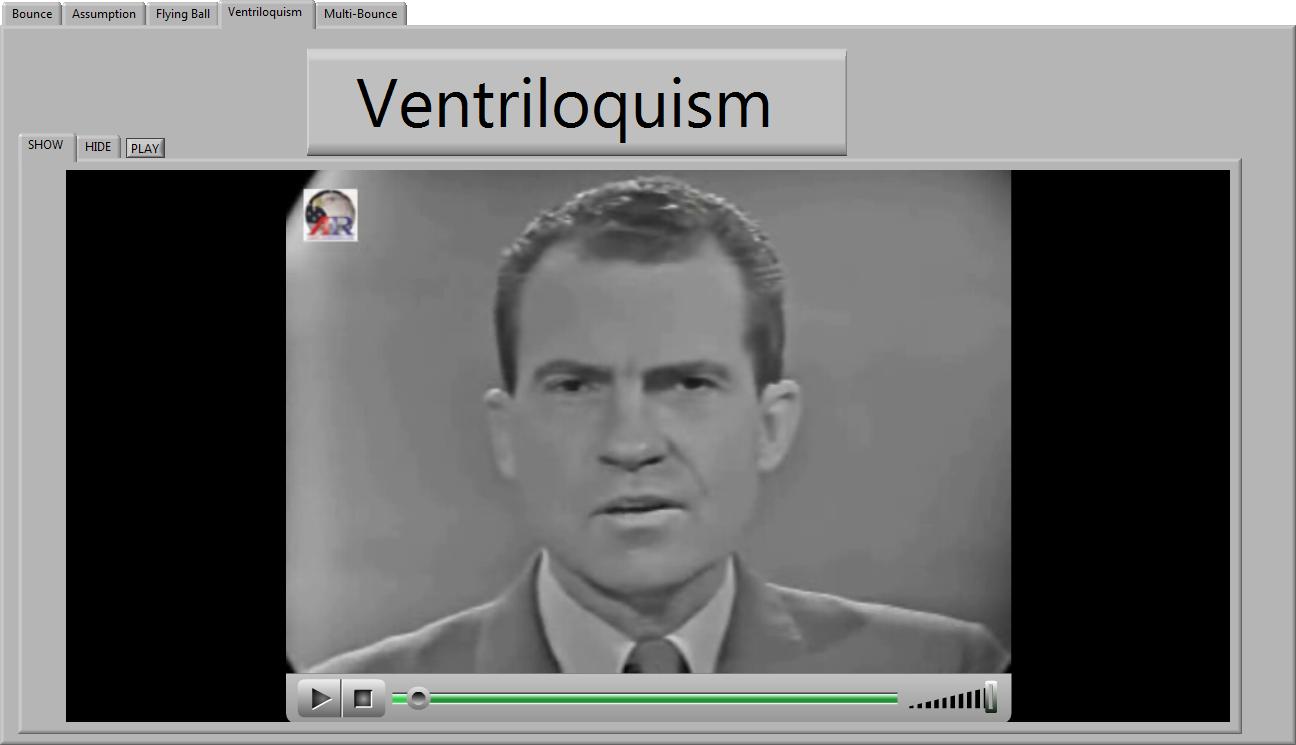 In this Illusion an audio track is started with a blank screen. In this case the voice is that of “Tricky Dick” in a debate against the fallen JFK (talk about optical illusions. . .). There is a single speaker places some distance away from the screen and the viewer is allowed to listen for some short period of time. As with the radio, viewers will tend to stare at the speaker as if it has moving lips. When the cover screen is removed and Richards face comes into view the viewer will instantly undergo the illusion that the voice now seems to emanate directly from the speakers mouth.