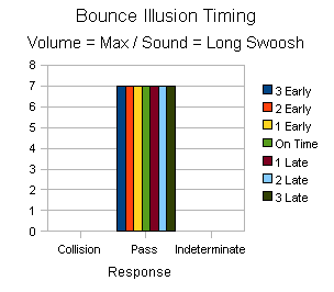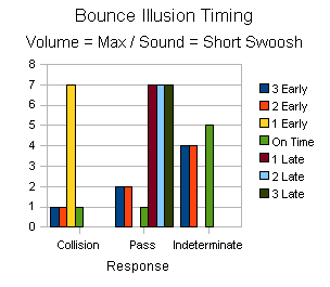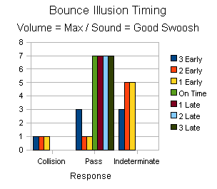 Two interesting things crop up in this data. One is that playing the sound 1 or 2 bars early seems to not effect the illusion. People are willing to accept the sound coming slightly early. This is counter intuitive since in real life you will always see an action occur before you will hear that sound. In any event once the sound was played 3 bars early the illusion broke and no one could see it. Similarly playing the illusion 3 bars late broke the illusion for everyone. Results were varied when the sound was played just after the collision. It seems that if someone was expecting to see a bounce they would and if they were expecting a pass they would see that. On subsequent tests the results started to be come more indeterminate when the sound was played 1 or 2 bars after the collision.
