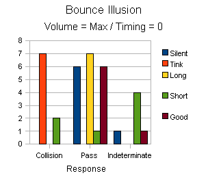 Here we see the results of administering the Bounce Illusion to seven subjectively selected subjects. For this test the audio was triggered right at the point where the two bars cross and the volume (as with all tests) was set to maximum. The viewer was first presented the illusion in silence to “dial in” the illusion. All but one viewer agreed that the bars appeared to “pass” each other in silence. One viewer insisted that the illusion was not consistent.