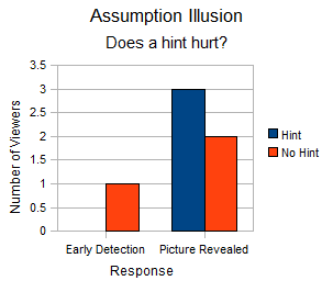Ok, bear with me while I turn up the subjective volume a few more notches. I had trouble finding a way to quantize this illusion so what I did was break the results down into two categories: Those who were able to identify the illusion BEFORE it was completely uncovered and those who could not. I only wanted to use one picture and I was obviously not a good contenstant so I broke the group into two. Half of the people were subjected to the Hint and half were not. Here is how it turned out: