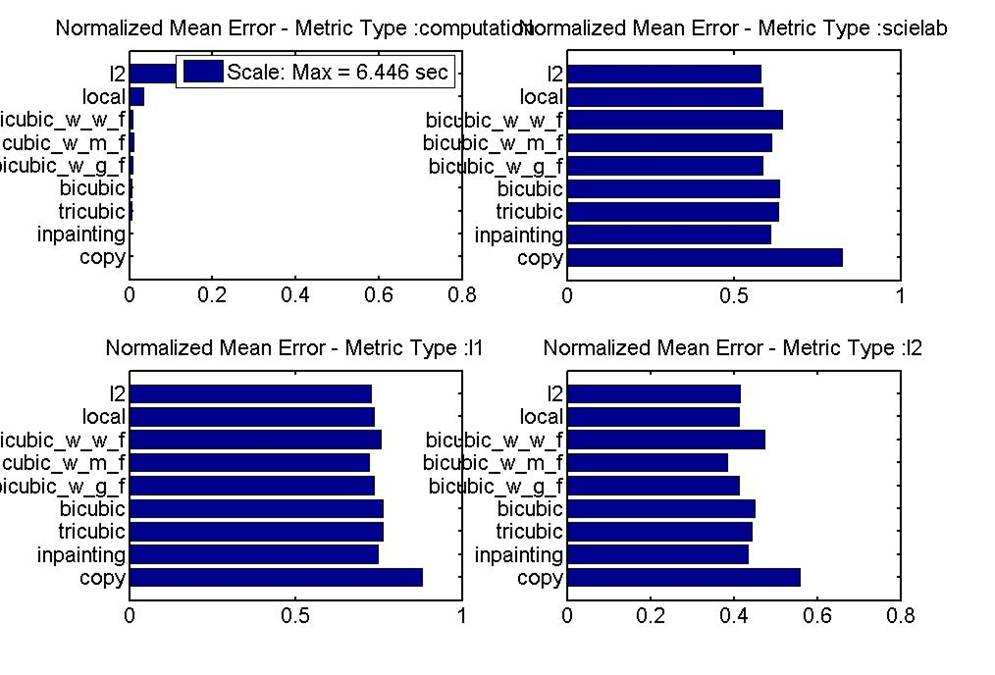The bar graphs for computation time and mean error show us on average how we can compare how these methods that perform over a wide range of images and missing lines. In terms of mean error (delta E, L1 Norm, or L2 Norm) all the methods perform very closely. Looking very carefully, we see that the best methods in terms of reducing mean delta E, are convex L2, interpolation with filters, and Inpainting. As expected, we found that adding a filtering stage after interpolation improved results as seen in experiments for reducing line scratches in archived film.