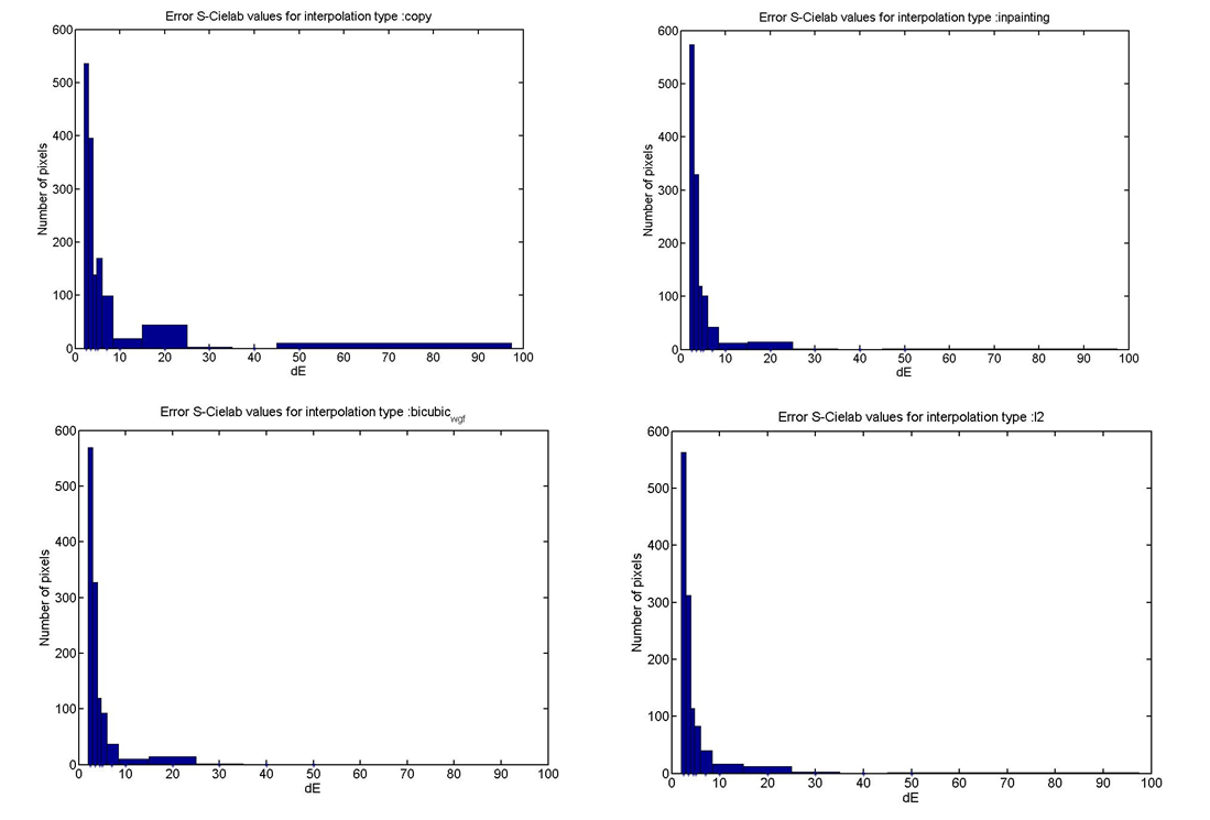 Looking at the histograms of delta E error distributions, we find several worthy points to establish. First, there is a significant reduction in the delta E errors compared to they copying method for all the methods shown in the results. Second, the convex L2 method produces the least number of errors in range of 10-20 delta E. However, it produces more errors in the 20-30 delta E range than Inpainting or Bicubic with Gaussian filter. It should be noted though that there are only a couple of errors produced in this range. Third, using a filter with interpolation method works just slightly better than using Inpainting across the entire range of errors. The reason maybe because there is only one stage for processing in Inpainting to interpolate, whereas interpolation with a filter has two stages for processing. The filter stage may reduce the artifacts resulting from typical interpolation methods such as aliasing, edge halo, and blurring.