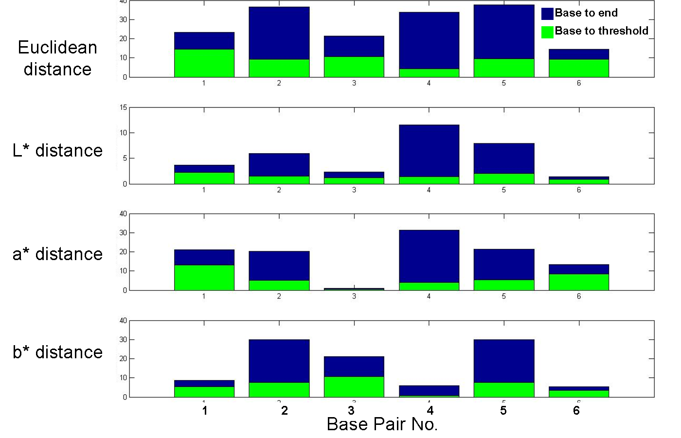 superimposed on the blue bars, show the Euclidean, L*, a*, and b* distances