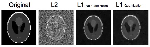 optics-free case and then using the digital camera simulator ISET. Outside of the DMD which we believe was this one, none of the optical properties of the single-pixel camera were available. We took the following numbers: for the first lens f (focal length) 0.08m, F number 4; for the second lens f 0.1m, F number 4; the photodiode is a single 2.8um*2.8um pixel with integration time 0.101s and geometric efficiency 85% (which does not matter that much since there is a single pixel); we assumed monochromatic light, illuminance 90 cd/m2, and 12 bit digitization. Losses at the DMD were not simulated. For all simulations below, we took K=1024 measurements of a 64 by 64 Shepp-Logan phantom