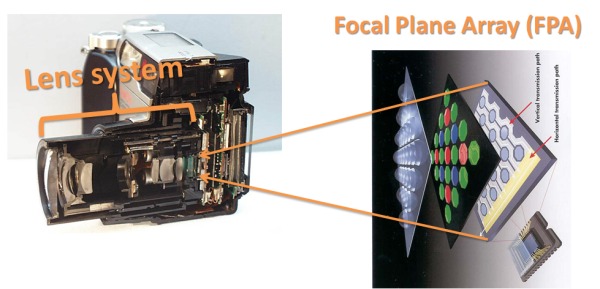 What is an FPA?an FPA or Focal Plane Array is the sensor array that collects the information in the digital camera. This plane is typically fabricated from a semiconductor wafer. As shown in the image there is typicaly a series of optical lenses then filter and microlens placed over the FPA. The FPA absorbs photons from different colors through the filters and that signal is ultimately what ends up being recorded as the captured optical image. Typical FPA inside a digital camera [1][2]