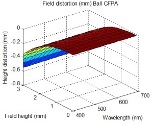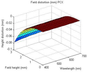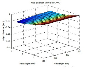 The figures above show that the field distortion of PCX is quite poor. The digital camera on the other hand has been optimized to minimize field distortion but the field distortion of the spherical Ball CFPA is poorer than the PCX by at least x10. This is unexpected and indicates that there is either an error with the prediction or the method of attaining the field distortion.