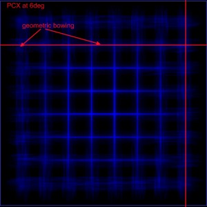 Looking at the images closely it appears as the lines are more of a skew than a bow. This could be attributed to errors in ISET for rotation of the PSF. Improper rotation of the PSF could result in misinterpretation of the images. This is an issue that will be corrected in newer versions of the software.