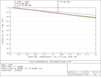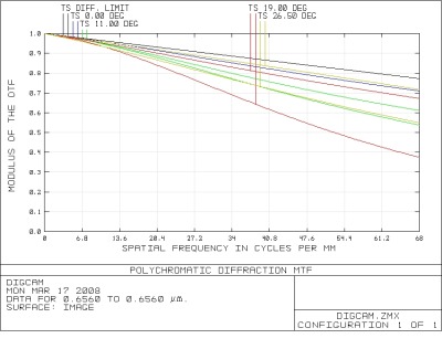 In summary the MTF of the Ball CFPA is much better than that of the Digital Camera MTF. This also indicates that we can expect the PSF of the Ball CFPA to be much better than that of the Digital Camera. The PCX MTF is not shown because Zemax was unable to use the data at angles where the spread was too great.