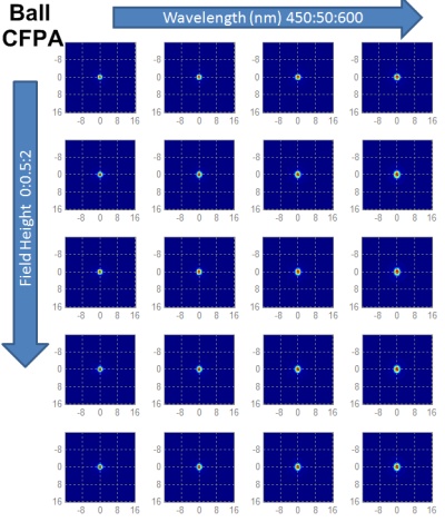 In these images we can tell that the PSF of the BallCFPA is better than the digital camera even when the field height reaches 2mm. But its important to note that digital camera lens system used in these simulations does quite well once the wavelength is above 450nm.