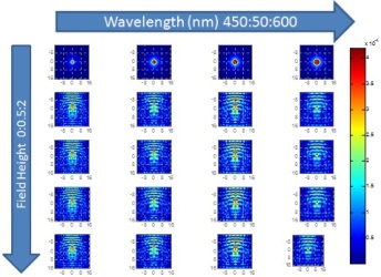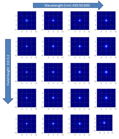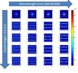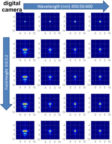 The following two figures show the PSF over a range of wavelength and a range of field height for both Ball CFPA and digital camera.