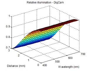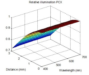 The images below display the results of the relative illuminations from the three types of lenses analyzed in this report. First we can see that the PCX and digital camera immediately start to decrease as the Distance (Field distance proportional to FOV angle) increases. While the relative illumination of the ball CFPA only decreases slightly. As mentioned before this result is expected because of the planar FPA cos^4(theta) relationship while the curved FPA only results in a cos(theta).