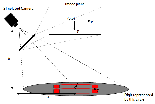 EyeLab: An Automated LED display analyzerMethodsAs mentioned, we developed three algorithms to ‘‘read’’ the digits on a 7-segment test equipment display. These algorithms were tested on two datasets. We first describe the datasets, then the algorithms, starting below. Test Data GenerationTo test the robustness of the algorithms, decoupled from noise (and other objects present) in the acquired “real data,” a series of test images were created. Utilizing the LED7 plugin for MATLAB [1], the digits 0-9 were rendered and saved as TIFF images. This plugin utilizes the fact that LED and LCD digit displays are typically of the “seven segment” variety — that is, there are seven “on or off” positions that are sufficient to convince us that something we are seeing is a particular digit. The seven segments are all visible in the representation of the number “eight,” and they are numbered in Figure 1 below: ![]() Figure 1 - Representation of seven segments used to form a digit. With the ten digits created, the next step was to render them at various perspectives (camera angles) to simulate the possible images that could be encountered in a real laboratory setting. Figure 2 shows the simulated camera setup. ![]() Figure 2 - Diagram showing the location of the simulated camera. The pinhole perspective equations are used to render each digit at a variety of camera angles.