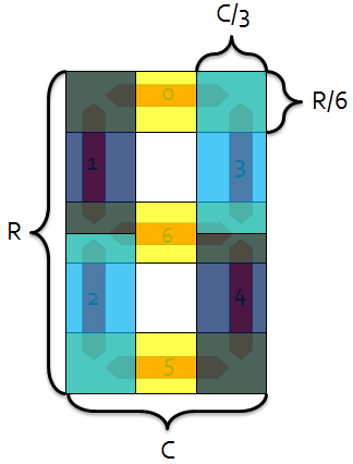 “Smart-strokes”The underlying principle behind the “Smart-strokes” algorithm is simple: there are only seven possible segments, and since we know where they should be, it should be relatively straightforward to see which ones are illuminated. To facilitate different “fonts” from different test equipment, seven “rather large” overlapping regions are chosen to represent the seven segments. These are indicated by the shaded regions in Figure 8. Note that the regions are defined in terms of relative height and width, making this a scale invariant method of digit identification. ![]() Figure 8 - Overlapping shaded "segment regions" for Smart-strokes algorithm. We can define a particular digit by a vector in 7-space, where each element of the vector (indexed according to Figure 8) corresponds to whether or not that segment is illuminated. For example, the digit four would be represented by the following vector: ![]() ![]() Figure 9 - "Smart-strokes" shaded regions for the digit "four." Having created our