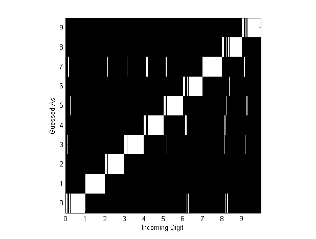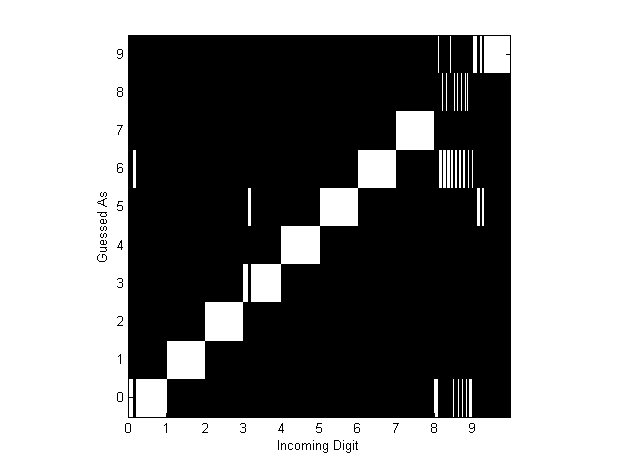 Table 2 - Run time (seconds) for all algorithms when run on generated test data. Two so-called “confusion diagrams” were created with the maximum resolution data to illustrate which digits were misidentified the most, and to learn about the various failure modes of the algorithms. These are shown in Figures 12 and 13. Each element along the ![]() Figure 12 - Confusion Diagram for "Smart-strokes" ![]() Figure 13 - Confusion Diagram for Cross-Correlation Using “Real” DataFor the “real data,” only the “Smart-strokes” and cross correlation algorithm were run, and only the run time could be computed. Note that the run-time for cross-correlation does not include the time it took for the user to identify the training digits. The results are in Table 3 below.