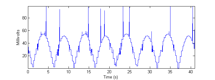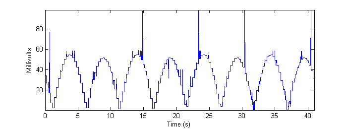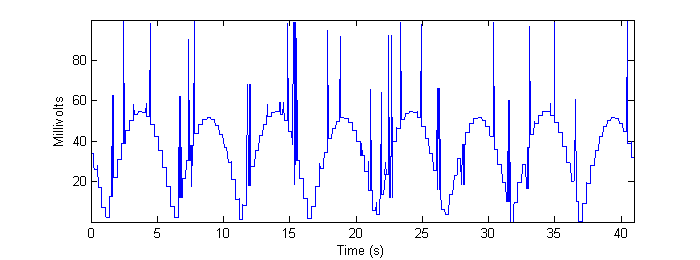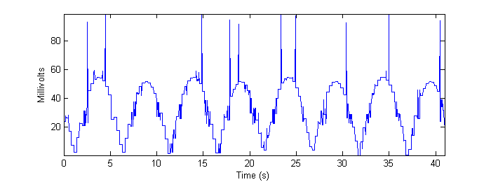 Table 3 - Run time (seconds) for Smart-strokes and Cross-correlation when run on real data. While we can’t quantitatively determine the MSE for the “real data,” it is still instructive to qualitatively look at the result of the identification algorithms for this data. Figures 14 and 15 below show the output of the system when measuring the real data. ![]() Figure 14 - Output of "Smart-strokes" algorithm applied to max-resolution real data. ![]() Figure 15 - Output of cross-correlation algorithm applied to max-resolution real data. Without a “gold standard,” it is difficult to gauge what happens to the accuracy of the algorithms acting upon the real data as the video is downsampled. Figures 16 and 17 show the outputs of the two algorithms on the highly downsampled 160 ![]() Figure 16 - Output of "Smart-strokes" algorithm applied to low-resolution real data. ![]() Figure 17 - Output of cross-correlation algorithm applied to low-resolution real data. The reader is encouraged to compare the preceding four figures to Figure 7b in Methods. Note, especially, the quantization artifact observed in the real data, as well as random “spikes” of misidentification that appear. The frame-grabs pertaining to these particular errors are shown and discussed in Conclusions. |