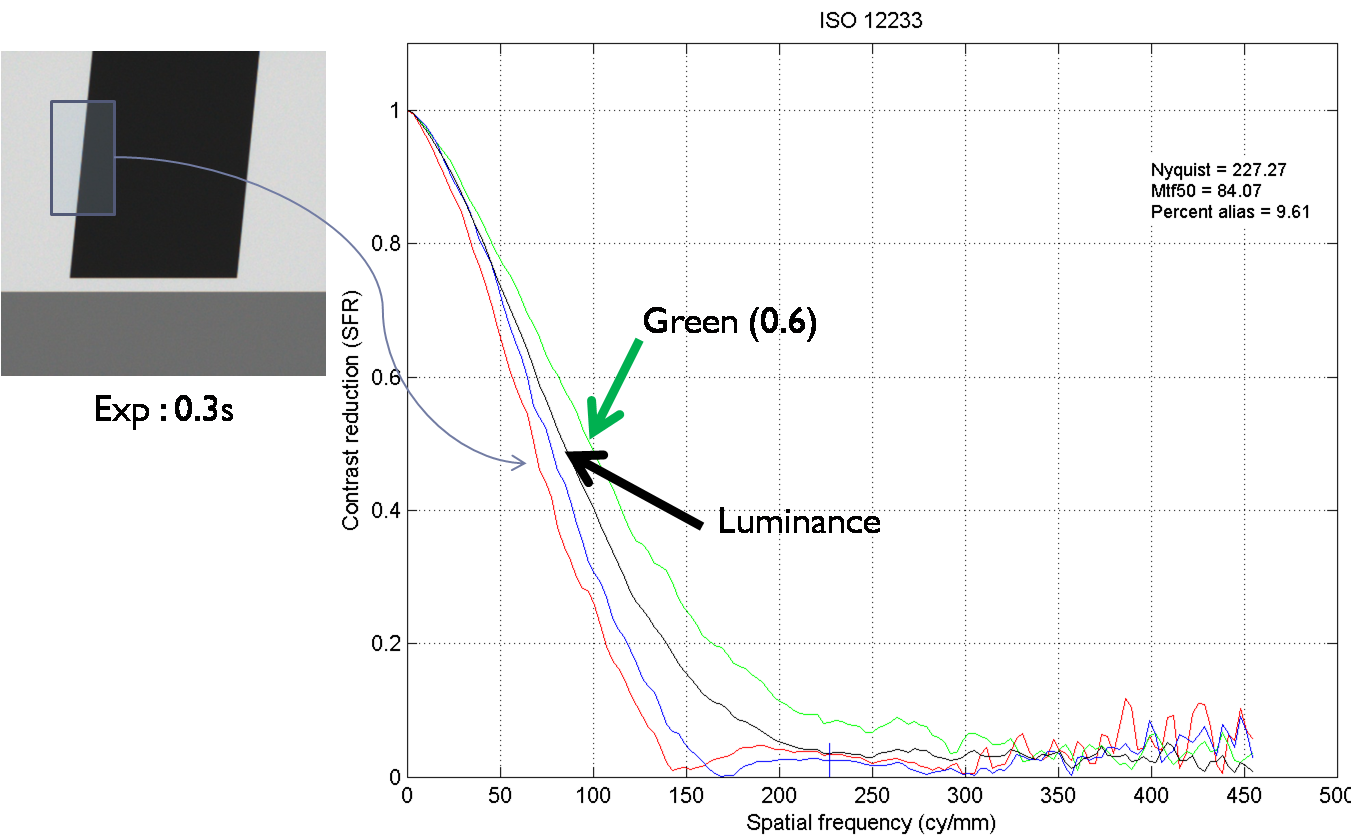 As can be seen in the above figure, for the Bayer image, the luminance channel MTF is always lesser than the green channel MTF, something not seen in RGB or Opponent images.