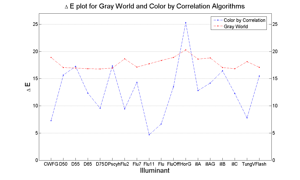 The figure below shows the average delta E obtained by averaging over 100 test synthetic images for each of the illuminants considered.