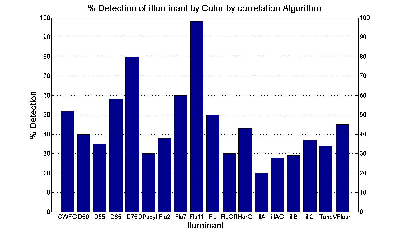 Also interesting to see is the percentage accuracy of the algorithm in terms of determining the correct illuminant. The figure below shows the percentage of times the algorithm correctly detected the illuminant in images that were synthesised under that illuminant.