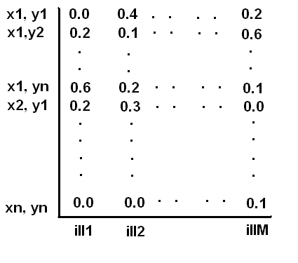 The column names - ill 1, ill 2 etc. represent the different illuminants in our representative set. The rows - (x1,y1) , (x1,y2) etc. represent each distinct region in our chromaticity space. As seen here, both chromaticity coordinates are divided into n distinct regions. Typical values of n are 16, 24 and 64.