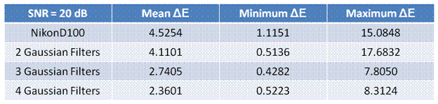 the sensors the distance metric in CIELAB decreased. However, when the SNR was reduced the Wiener