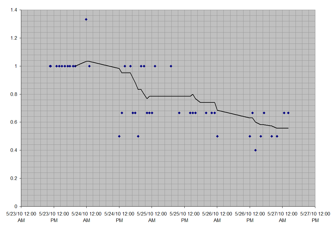 The Y-axis here is the Snellen fraction. For example, 1 represents the fraction 20/20. The X-axis is the time of the reading. The line shown is the moving average of the results. As can be seen, the moving average degrades fairly linearly over time.