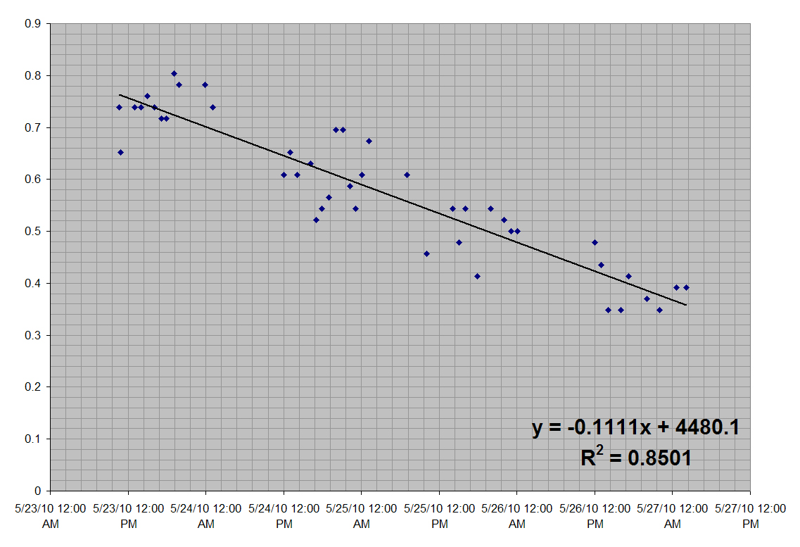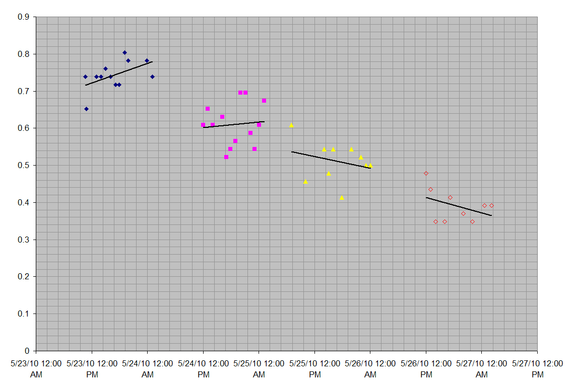 Here the Y-axis is the percent of letters identified correctly and the X-axis is time. A linear decrease over time is fairly evident, with an R2 value of 0.8501. Next we split the results by day.